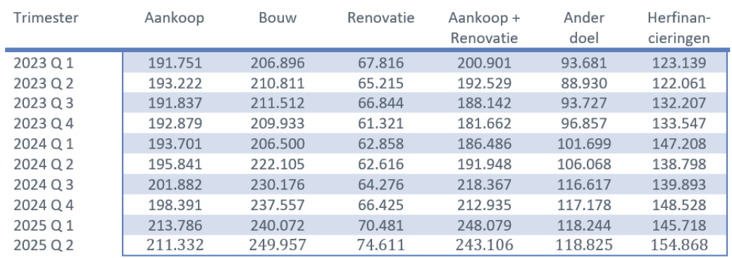 Daarentegen is het gemiddelde bedrag van een bouwlening in het tweede kwartaal van 2025 sterk gestegen, tot 250.000 euro.
