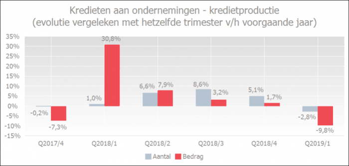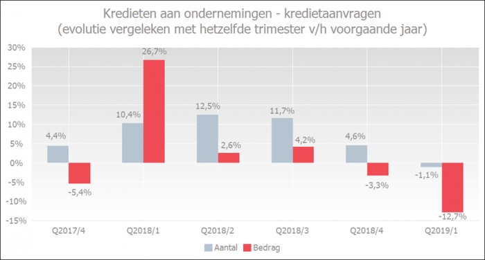 In het eerste trimester van 2019 vroegen ondernemers 1,1% minder kredieten aan dan in dezelfde periode vorig jaar. In bedrag was er sprake van een sterke daling van 12,7% wat verklaard kan worden door een uitzonderlijk hoog bedrag van kredietaanvragen in hetzelfde trimester vorig jaar.
