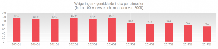 De weigeringsgraad van het eerste trimester van 2019 ligt in vergelijking met alle eerste trimesters op het laagste niveau sinds de start van de metingen in 2009.