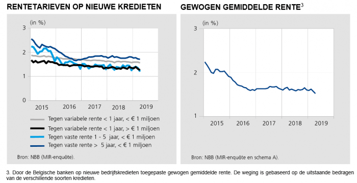 Ondanks de gunstige tarieven hadden de ondernemingen in het eerste trimester van 2019 minder financieringsbehoefte waardoor de vraag naar krediet daalde. In april 2019 daalde de gewogen gemiddelde rente op nieuwe bedrijfskredieten tot een nieuw laagtepunt van 1,52%.