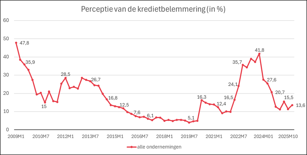 Op basis van de resultaten van de kwartaalenquête van de Nationale Bank van België (NBB) over de perceptie van de kredietbelemmeringen bij ondernemingen, zouden de banken hun kredietvoorwaarden zeer licht hebben verstrakt. Het niveau van de kredietbelemmeringen ligt evenwel nog steeds op een laag peil. Het deel van de ondernemingen die de kredietvoorwaarden als ongunstig beschouwden, was in oktober 2025 gestegen tot 13,6%. In juli 2025 lag dit percentage op 11,4%. De perceptie van de kredietbelemmeringen hangt in belangrijke mate samen met de hoogte van de aangerekende krediettarieven, die in augustus en september van 2025 lichtjes zijn gestegen.