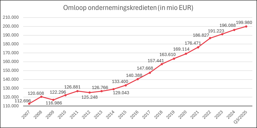 Het uitstaand volume aan ondernemingskredieten lag eind september 2025 3,8% hoger dan een jaar eerder en bedroeg 200 miljard euro.