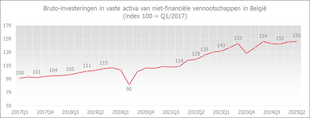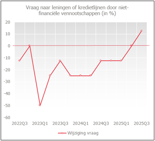 Ook uit de Bank Lending Survey (BLS) van de Europese Centrale Bank (ECB) blijkt dat de vraag naar leningen of kredietlijnen door niet-financiële vennootschappen in het derde kwartaal van 2025 positief is geëvolueerd.
