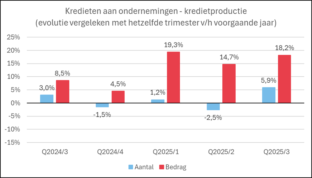De hogere kredietvraag weerspiegelde zich in meer nieuwe verstrekte kredieten. In het derde trimester van 2025 werden er 5,9% meer ondernemingskredieten toegekend dan in dezelfde periode van 2024. Het bedrag van de verstrekte kredieten steeg met 18,2%.