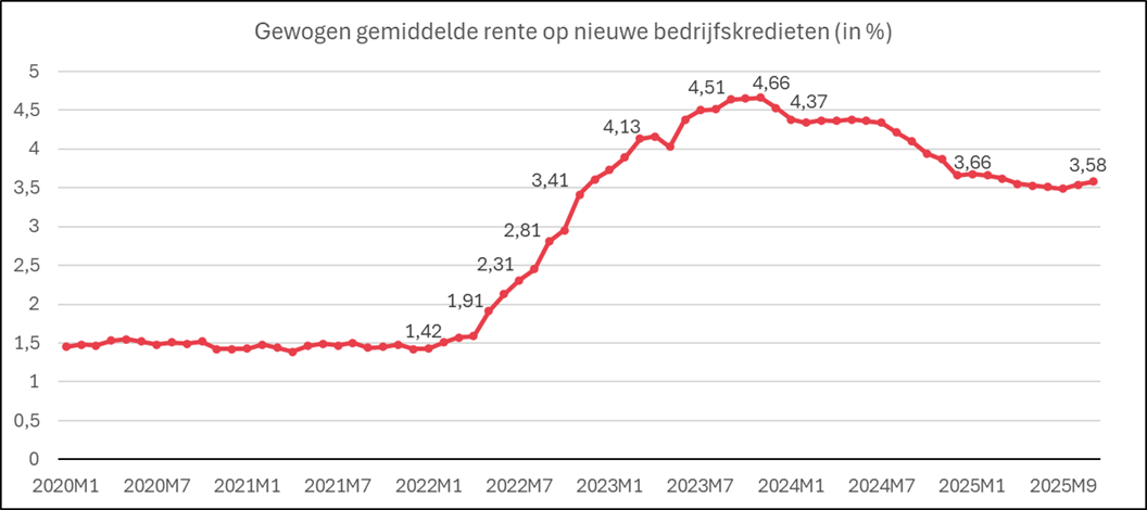 De gewogen gemiddelde rente op nieuwe bedrijfskredieten had in november 2023 een piek bereikt van 4,66%. In juli 2025 was die gemiddelde rente reeds meer dan 1 procentpunt gedaald tot 3,49%. In augustus en september 2025 steeg de gewogen gemiddelde rente op nieuwe bedrijfskredieten lichtjes (respectievelijk naar 3,54% en 3,58%).