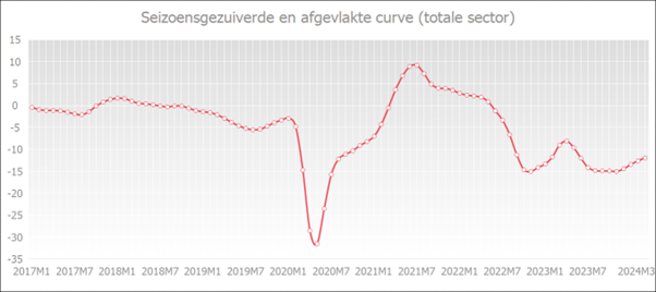 Het ondernemersvertrouwen is zich geleidelijk aan beginnen herstellen vanaf december 2023. De curve hieronder, geeft de onderliggende conjunctuurtrend weer. Zo geeft een stijging in de curve een weergave van de versterking van het ondernemersvertrouwen