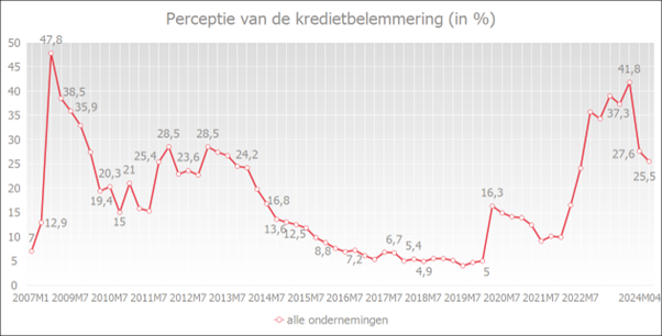 De perceptie was sterk beginnen stijgen eind 2021, wat voor een groot deel samenhing met de stijging van de rentetarieven. Vanaf eind 2023 zijn de rentevoeten wat lager komen te liggen en weerspiegelt zich dat in de perceptie van de kredietbelemmering.