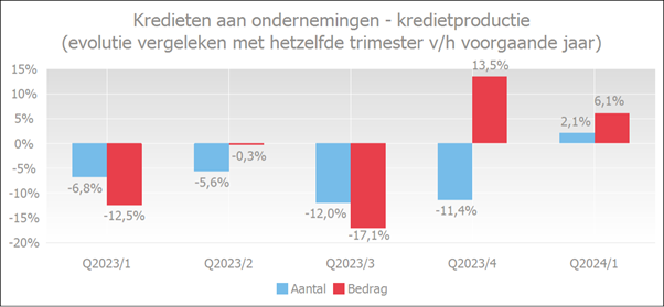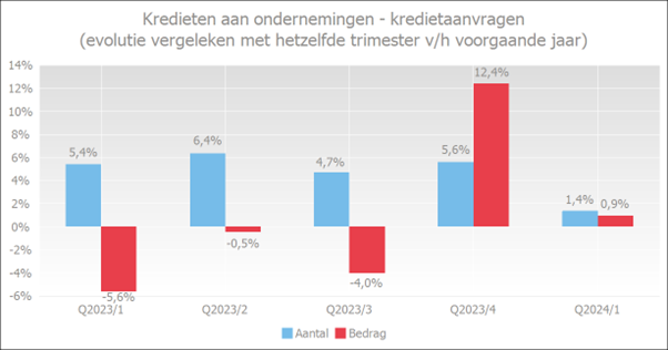In het eerste trimester van 2024 werden er 1,4% meer ondernemingskredieten aangevraagd dan in dezelfde periode van 2023, het totaalbedrag van deze aangevraagde kredieten steeg vrij beperkt met 0,9%.