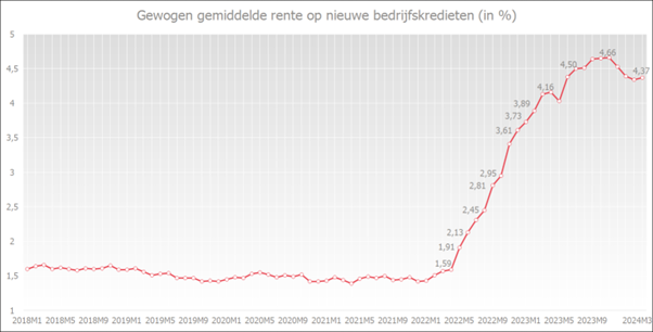 De gewogen gemiddelde rente op nieuwe bedrijfskredieten lijkt in november 2023 met 4,66% haar piek te hebben bereikt. In maart 2024 bedroeg die rente nog 4,37%.
