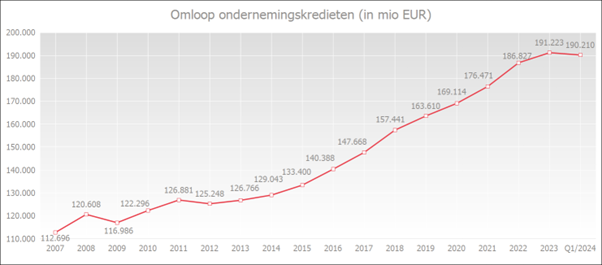 Eind maart 2024 bedroeg het uitstaande bedrag aan opgenomen ondernemingskredieten, inclusief verbinteniskredieten (zoals garantiekredieten en documentaire kredieten), 190,2 miljard euro, wat 1,6% meer was dan een jaar eerder.
