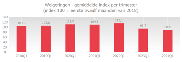 De weigeringsgraad lag in het eerste trimester van 2024 op het laagste niveau van alle eerste trimesters sinds 2018.