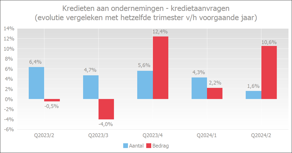 In het tweede trimester van 2024 werden er 1,6% meer ondernemingskredieten aangevraagd dan in dezelfde periode van 2023, en het totaalbedrag van deze aangevraagde kredieten steeg zelfs met 10,6%.