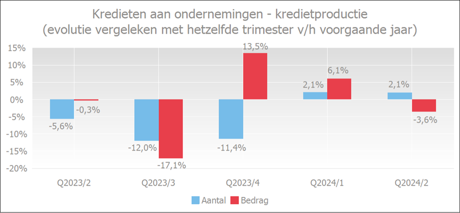 Het aantal verstrekte kredieten steeg in het tweede trimester van 2024 ten opzichte van hetzelfde trimester vorig jaar met 2,1%. De verstrekte bedragen lagen echter 3,6% lager dan in hetzelfde trimester van vorig jaar, maar dat is te verklaren door een uitzonderlijk groot krediet dat in het tweede kwartaal van 2023 werd verleend. Dit beïnvloedt de vergelijking tussen beide trimesters in 2023 en 2024.