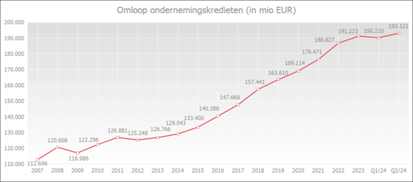 Eind juni 2024 bedroeg het uitstaande bedrag aan opgenomen ondernemingskredieten, inclusief verbinteniskredieten (zoals garantiekredieten en documentaire kredieten), 193,1 miljard euro, wat 1,8% meer was dan een jaar eerder.