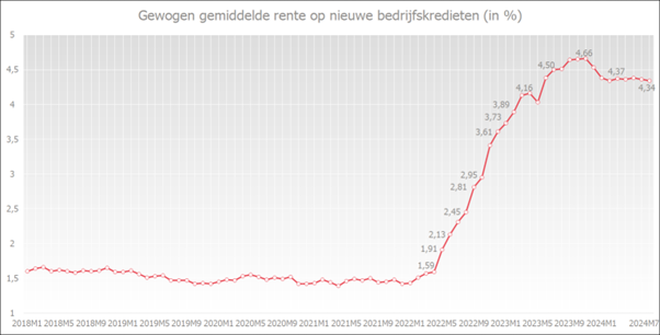 De gewogen gemiddelde rente op nieuwe bedrijfskredieten heeft in november 2023 met 4,66% haar piek bereikt. In juli 2024 daalde die rente tot 4,34% (tegen 4,36% in juni 2024).