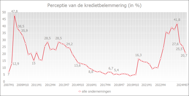 Ook de resultaten van de kwartaalenquête van de Nationale Bank van België (NBB) over de perceptie van de kredietbelemmeringen bij ondernemingen, geven aan dat de banken hun kredietvoorwaarden licht zouden hebben versoepeld. Het deel van de ondernemingen die de kredietvoorwaarden als ongunstig beschouwden, lag in juli 2024 op 20,7%, terwijl dat in april 2024 nog 25,5% was.