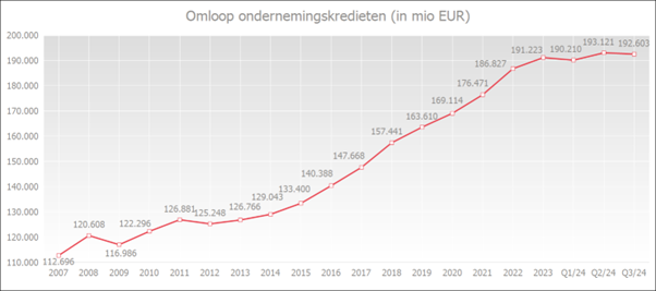 Eind september 2024 bedroeg het uitstaande bedrag aan opgenomen ondernemingskredieten, inclusief verbinteniskredieten (zoals garantiekredieten of documentaire kredieten), 192,6 miljard euro, wat 2,0% meer was dan een jaar eerder.