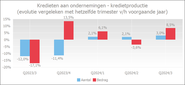 In het derde trimester van 2024 werden er 0,9% meer ondernemingskredieten aangevraagd dan in dezelfde periode van 2023, en het totaalbedrag van deze aangevraagde kredieten steeg zelfs met 14,0%.