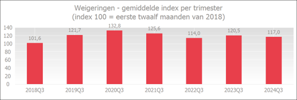Ten opzichte van alle voorgaande derde trimesters ligt de weigeringsgraad in het derde trimester van 2024 op het derde laagste niveau sinds 2018.
