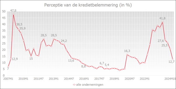 De perceptie was sterk beginnen stijgen eind 2021, wat voor een groot deel samenhing met de stijging van de rentetarieven. Vanaf eind 2023 zijn de rentevoeten wat lager komen te liggen en weerspiegelt zich dat in de perceptie van de kredietbelemmering.
