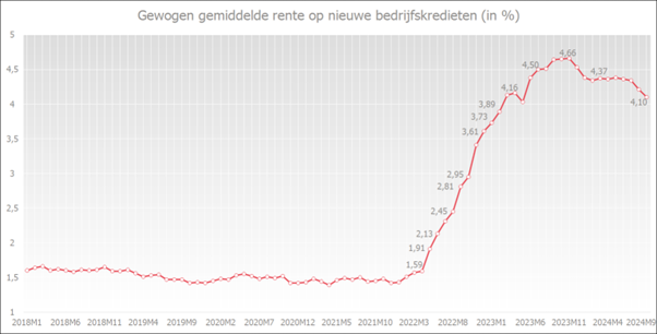 De gewogen gemiddelde rente op nieuwe bedrijfskredieten heeft in november 2023 met 4,66% haar piek bereikt. In september 2024 was die rente reeds gedaald tot 4,10%.