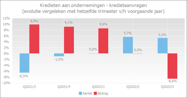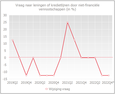 Uit de BLS-enquête (Bank Lending Survey) blijkt volgens de vier grote banken dat de vraag naar leningen of kredietlijnen door niet-financiële vennootschappen in het derde trimester van 2022 is afgenomen. Men verwacht dat dit ook het geval zal zijn in het vierde trimester van 2022. Er is vooral minder vraag naar kredieten voor het financieren van investeringen en overnames.
