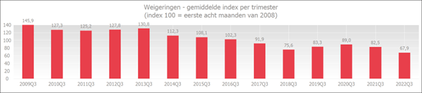 De banken hebben in het derde trimester procentueel nog nooit zo weinig kredietaanvragen geweigerd. De weigeringsgraad ligt voor een derde trimester dan ook op het laagste niveau ooit.