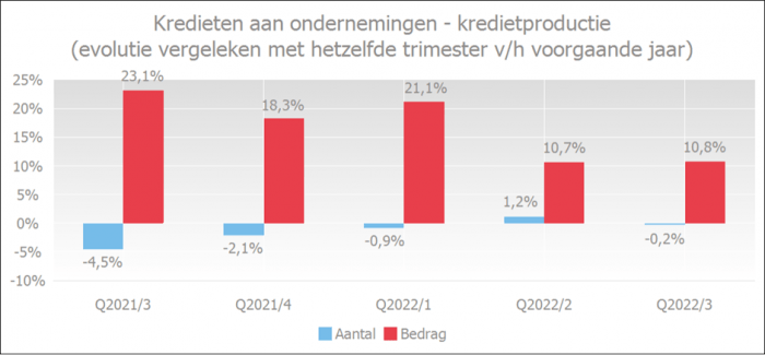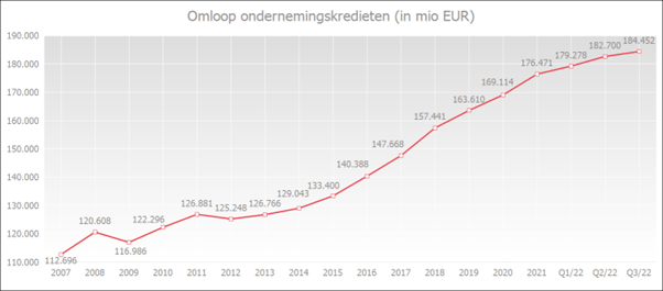 Het uitstaand volume aan ondernemingskredieten lag eind september 2022 6,3% hoger dan een jaar eerder en bedroeg 184,4 miljard euro. Het bedrag aan opgenomen kredieten lag nog nooit zo hoog.