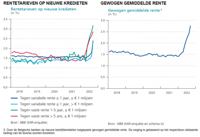 Volgens gegevens van de NBB bedroeg de gewogen gemiddelde rente op nieuwe bedrijfskredieten in september 2022 2,77% (t.o.v. 2,41% in augustus 2022). De rentetarieven hebben een aantal jaren rond 1,5% geschommeld, maar vanaf februari 2022 zijn ze beginnen te stijgen door de hogere marktrentes.