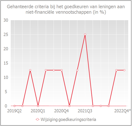 Nochtans meldden de vier grote banken via de BLS-enquête dat de gehanteerde criteria bij het goedkeuren van leningen (of kredietlijnen) aan niet-financiële vennootschappen in het derde trimester van 2022 werden aangescherpt. Men verwacht dat dit ook het geval zal zijn in het vierde trimester van 2022. Dit kan vooral worden verklaard door de minder goede verwachtingen voor de economische bedrijvigheid.