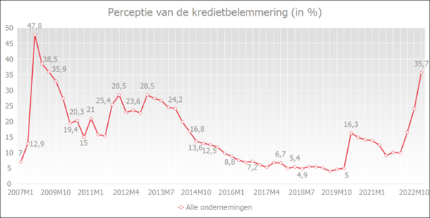 Ook de resultaten van de kwartaalenquête van de Nationale Bank van België (NBB) over de perceptie van de kredietbelemmeringen bij ondernemingen, geven aan dat de banken hun kredietvoorwaarden zouden hebben verstrengd. Volgens die enquête waren er in oktober 2022 meer ondernemers die een grotere kredietbelemmering ervaarden dan voordien. Het deel van de ondernemingen die de kredietvoorwaarden als ongunstig beschouwden, lag in oktober 2022 immers op 35,7%, terwijl dat in juli 2022 maar 24,1% was.