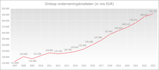 De stijging van de kredietproductie heeft nog niet geleid tot een bijzonder sterke groei van het uitstaand volume. Dat volume aan ondernemingskredieten lag eind december 2023 2,4% hoger dan een jaar eerder en bedroeg 191,2 miljard euro.