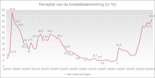 De perceptie van de kredietbelemmering door de ondernemingen gaat evenwel reeds in stijgende lijn sinds begin 2022, wat voor een groot deel samenhangt met de stijging van de rentetarieven. Uit de kwartaalenquête van de Nationale Bank van België (NBB) blijkt dat de perceptie van de kredietbelemmering door ondernemingen in oktober 2023 op 41,8 % lag. In januari 2022 bedroeg die perceptie nog maar 9,9 %. Dit valt bijna volledig te verklaren door de gestegen rentevoeten. De gewogen gemiddelde rentevoet is vanaf begin 2022 beginnen stijgen, door de renteverhogingen van de ECB. Dit heeft de perceptie van kredietbelemmering bij ondernemingen doen toenemen.