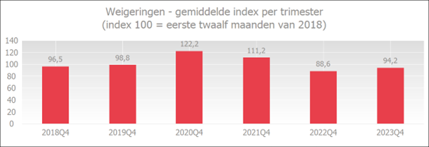 Ten opzichte van het vierde kwartaal van 2022 lag de weigeringsgraad van datzelfde kwartaal in 2023 wat hoger.