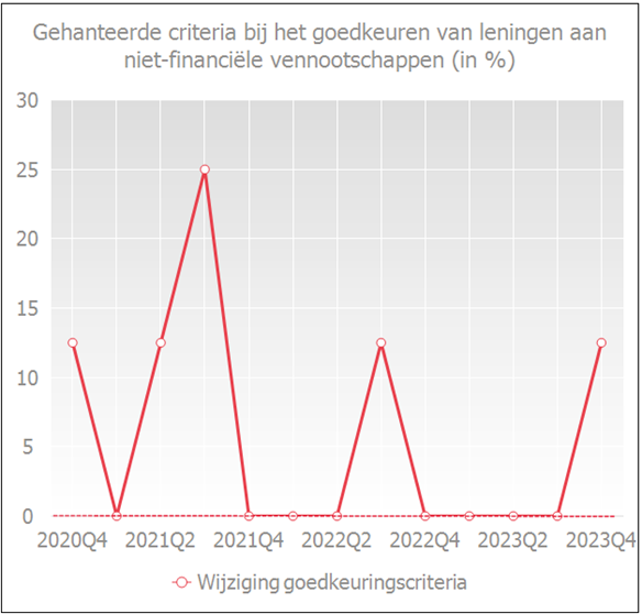 Ook in de BLS-enquête (Bank Lending Survey) melden de banken dat ze hun goedkeuringscriteria hebben aangescherpt in het vierde kwartaal van 2023. De belangrijkste reden die ze ook hiervoor opgeven is de onzekere economische situatie.