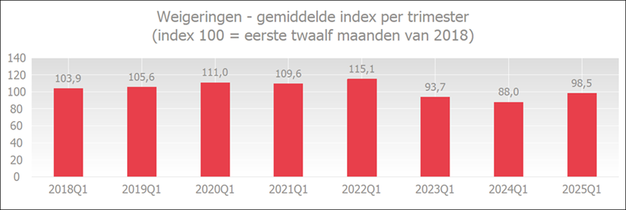 De weigeringsgraad was in het eerste kwartaal van 2025 wat hoger dan in het eerste kwartaal van de 2 voorgaande jaren, maar ligt nog steeds op een laag niveau.