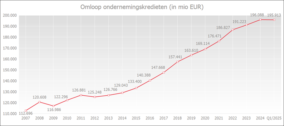 Eind maart 2025 bedroeg het uitstaande bedrag aan opgenomen ondernemingskredieten, inclusief verbinteniskredieten, 195,9 miljard euro, wat 3,0% meer was dan een jaar eerder.