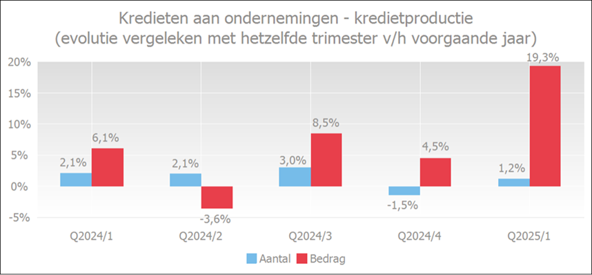 In het eerste trimester van 2025 werden er ten opzichte van hetzelfde trimester vorig jaar hogere kredietbedragen aangevraagd en toegekend. Zo steeg het bedrag van de kredietaanvragen met 16,0%. Het bedrag van de nieuwe verstrekte kredieten steeg met 19,3%. Dit valt vooral te verklaren door enkele grote verstrekte kredietlijnen.