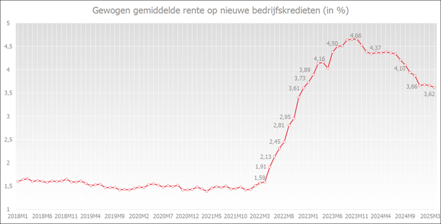 De gewogen gemiddelde rente op nieuwe bedrijfskredieten had in november 2023 een piek bereikt van 4,66%. In maart 2025 was die rente reeds gedaald tot 3,62%.