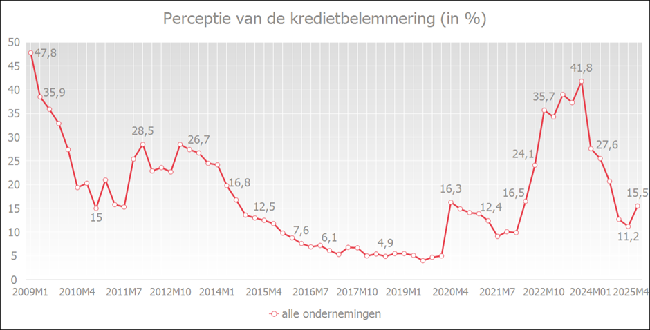 Ook de resultaten van de kwartaalenquête van de Nationale Bank van België (NBB) over de perceptie van de kredietbelemmeringen bij ondernemingen, geven aan dat de banken hun kredietvoorwaarden licht zouden hebben verstrakt. Het deel van de ondernemingen die de kredietvoorwaarden als ongunstig beschouwden was in januari 2025 gedaald tot een dieptepunt van 11,2 %. In april 2025 steeg dit cijfer tot 15,5%.