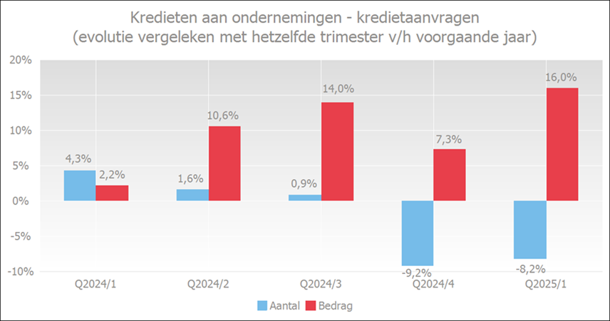 In het eerste trimester van 2025 vroegen ondernemers 8,2% minder kredieten aan dan in dezelfde periode vorig jaar maar voor een hoger bedrag. Het aangevraagde bedrag steeg namelijk met 16,0%.