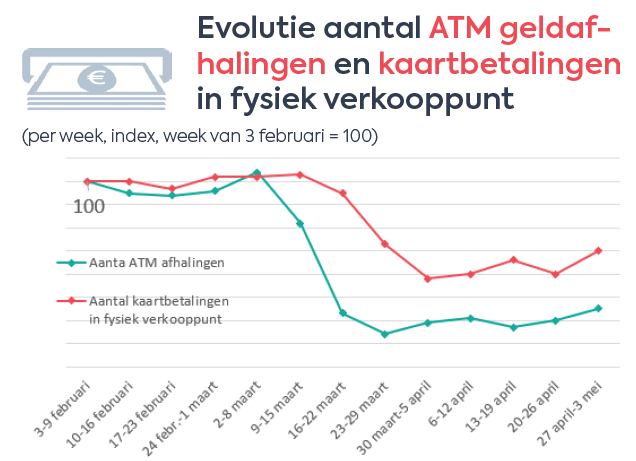 Doordat een heel aantal winkels tot nu toe gesloten waren tijdens de coronacrisis daalde het totale aantal kaartbetalingen dat in een fysiek verkooppunt gebeurde wel. De daling van het aantal geldafhalingen zette zich echter nog sterker door. Dit lijkt erop te wijzen dat de Belg momenteel vaker de kaart bovenhaalt dan dat hij of zij cash betaalt. Febelfin roept alvast op om zo veel mogelijk digitaal (via de kaart en de smartphone) te blijven betalen, zeker wanneer alle winkels vanaf 11 mei opnieuw de deuren mogen openen.