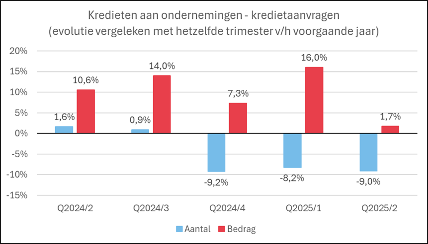 De stijging in bedrag betekent echter niet dat er zich ook een stijging optekende in het aantal aangevraagde en verstrekte kredieten. In het tweede trimester van 2025 werden er 9,0% minder ondernemingskredieten aangevraagd dan in dezelfde periode van 2024. Het aantal verstrekte kredieten daalde met 2,5%.
