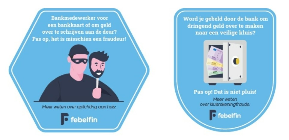 Febelfin heeft onlangs visuals gemaakt met hierop verschillende fraudevormen (zoals kluisrekeningfraude en bankkaart phishing aan huis) uitgelegd. Bedoeling van dit beeldmateriaal is sensibilisering en bewustmaking rond de verschillende bestaande fraudevormen. De visuals zullen verspreid worden via de verschillende communicatiekanalen van Febelfin, en ook verdeeld worden onder verschillende partners. Je vindt ze terug onder Febelfin 'publicaties'.