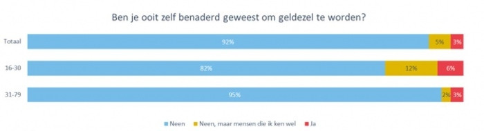 In hetzelfde onderzoek geeft 3% van de bevolking aan ooit benaderd te zijn met de vraag om geldezel te worden. Bij de jongeren ligt dit fors hoger: 6% is zelf benaderd en nog eens 12% kent iemand die ooit benaderd werd.