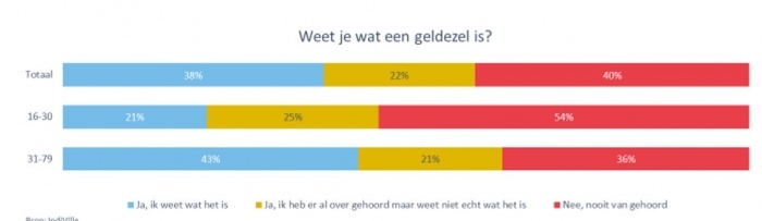Verontrustend is dat slechts 38% van de totale bevolking weet wat een geldezel is. Een vooruitgang met 2019 toen het cijfer op 22% lag, maar het blijft nog steeds laag. Opvallend: Bij de jongeren weet slechts 21% wat een geldezel is. Dit betekent dat 8 op 10 jongeren niet weten wat een geldezel is.