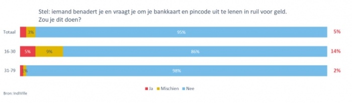 Uit een onderzoek van Febelfin in samenwerking met onderzoeksbureau IndiVille blijkt dat vooral jongeren heel vatbaar zijn om geldezel te worden. 14% zou het overwegen om hun bankkaart en pincode te geven in ruil voor geld.