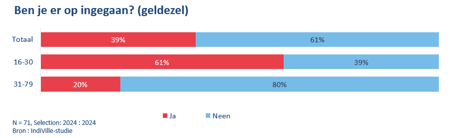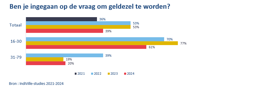 Volgens het onderzoek zou 3% van de Belgen al eens gevraagd zijn om geldezel te worden. 39% van zij die deze vraag kregen, accepteerde het aanbod. Bij de 16-30-jarigen ging 61% hierop in.