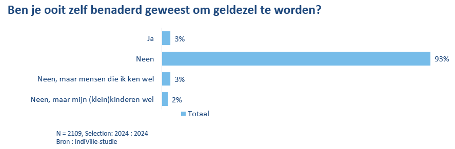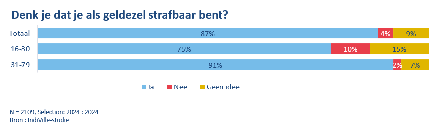 Als we naar de cijfers van het onderzoek kijken, denkt 10% van de Belgische jongeren dat fungeren als geldezel niet strafbaar is en tast 15% hierover in het duister. Voor de totale Belgische bevolking bedragen deze percentages respectievelijk 4% en 9%.