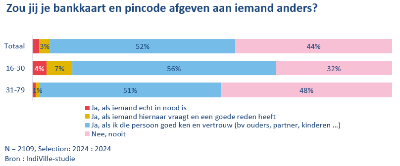 4% van de Belgische bevolking zou zijn/haar bankkaart met pincode geven aan iemand die ze niet kennen. Onder de jongeren bedraagt dit aandeel 11%. Dit is een lichte verbetering ten opzichte van vorig jaar (17%).